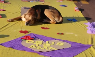 Durante celebração no Jardim Coopagro, vira-lata deitou tranquilamente no meio da procissão e encantou fiéis com simplicidade e paz