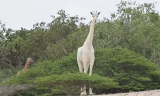 "A girafa branca, símbolo de raridade e esperança, agora caminha protegida pela tecnologia, oferecendo uma nova chance à sua espécie ameaçada pela ação humana."