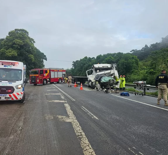 Motorista fica gravemente ferido após batida envolvendo caminhões na BR-277